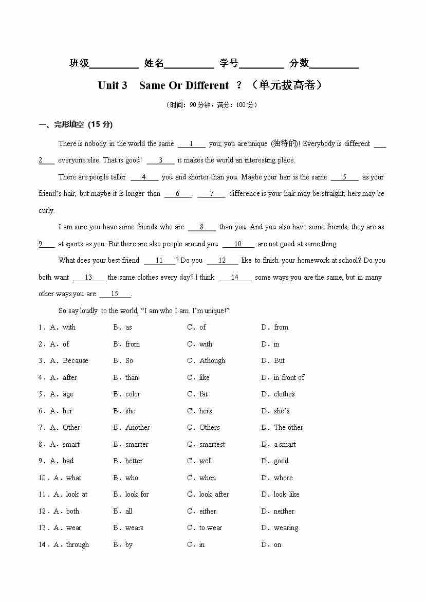 Unit 3 Same Or Different 【单元拔高卷】(解析版)