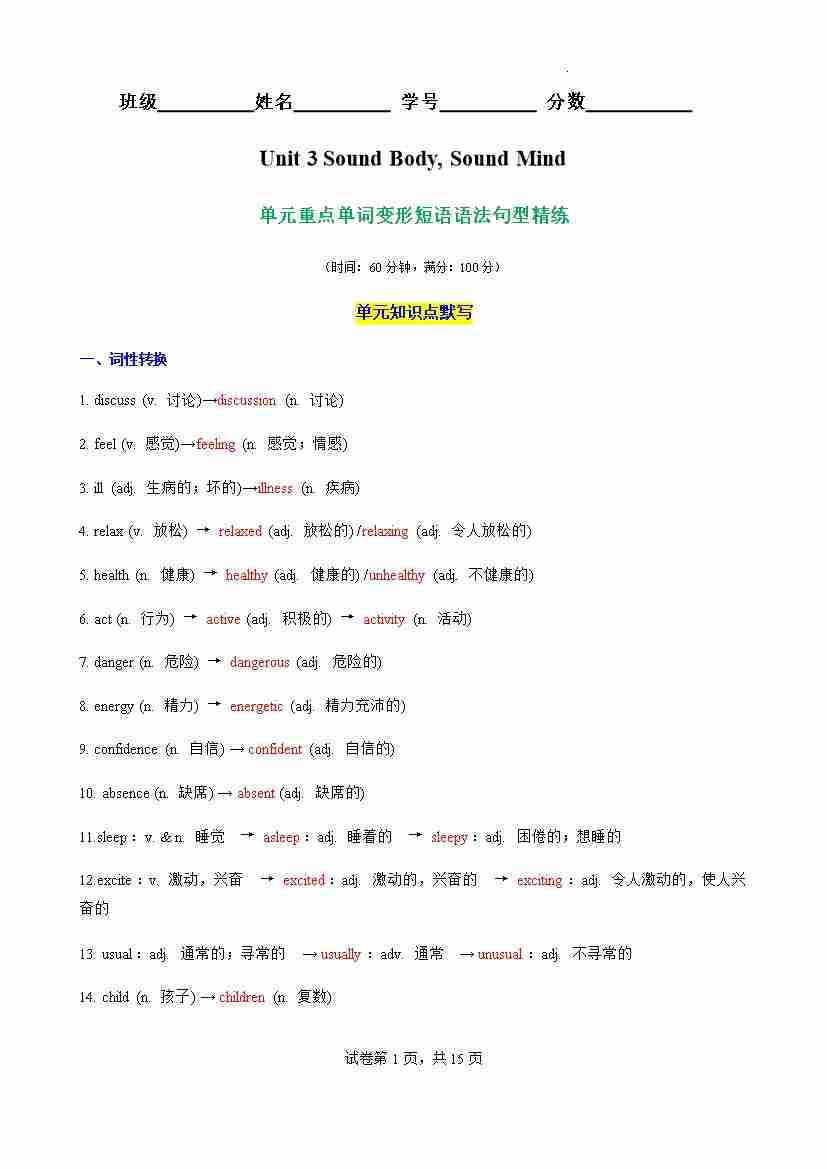 Unit 3 Sound Body, Sound Mind 重点单词,词性转换,短语,语法,句型精练(解析版)