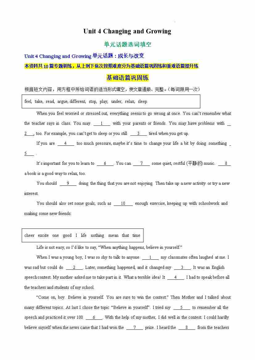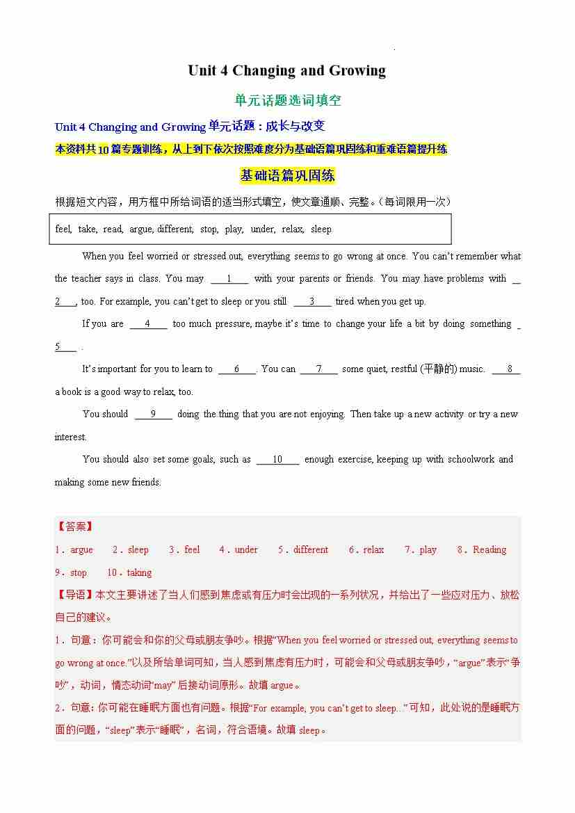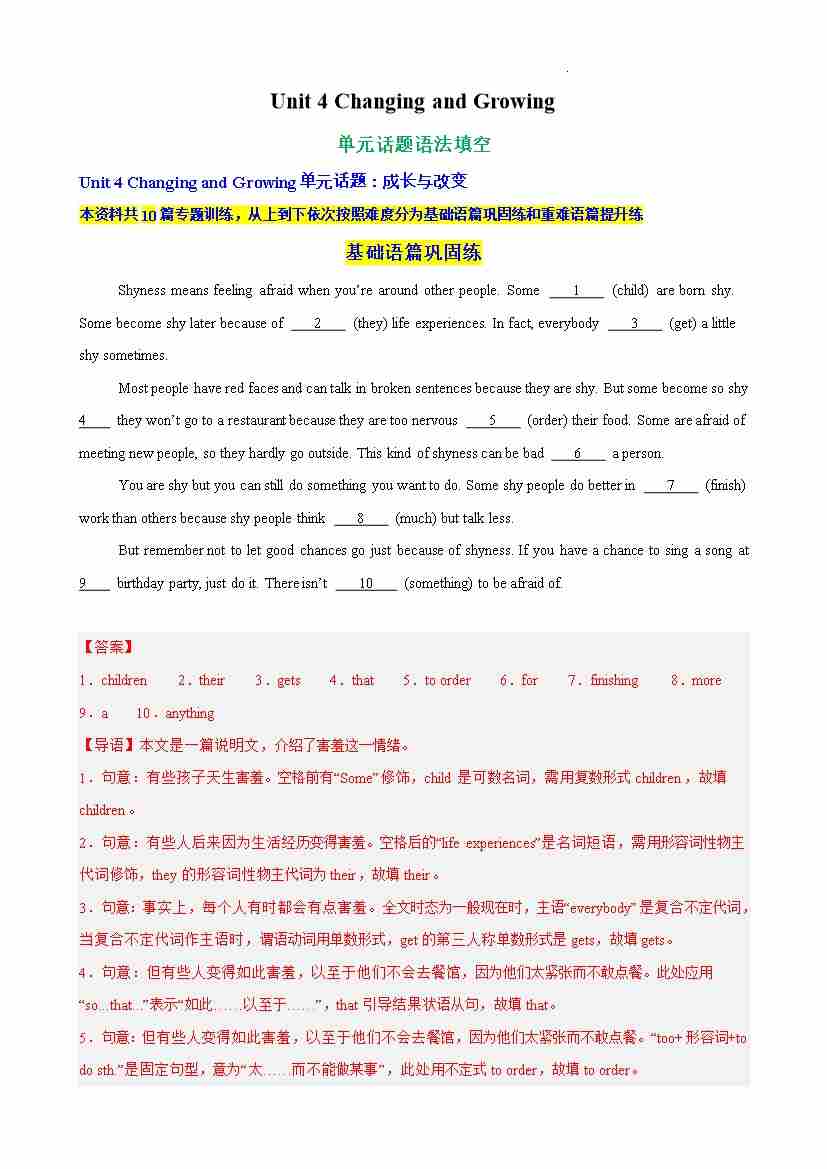Unit 4 Changing and Growing单元话题语法填空练习(解析版)