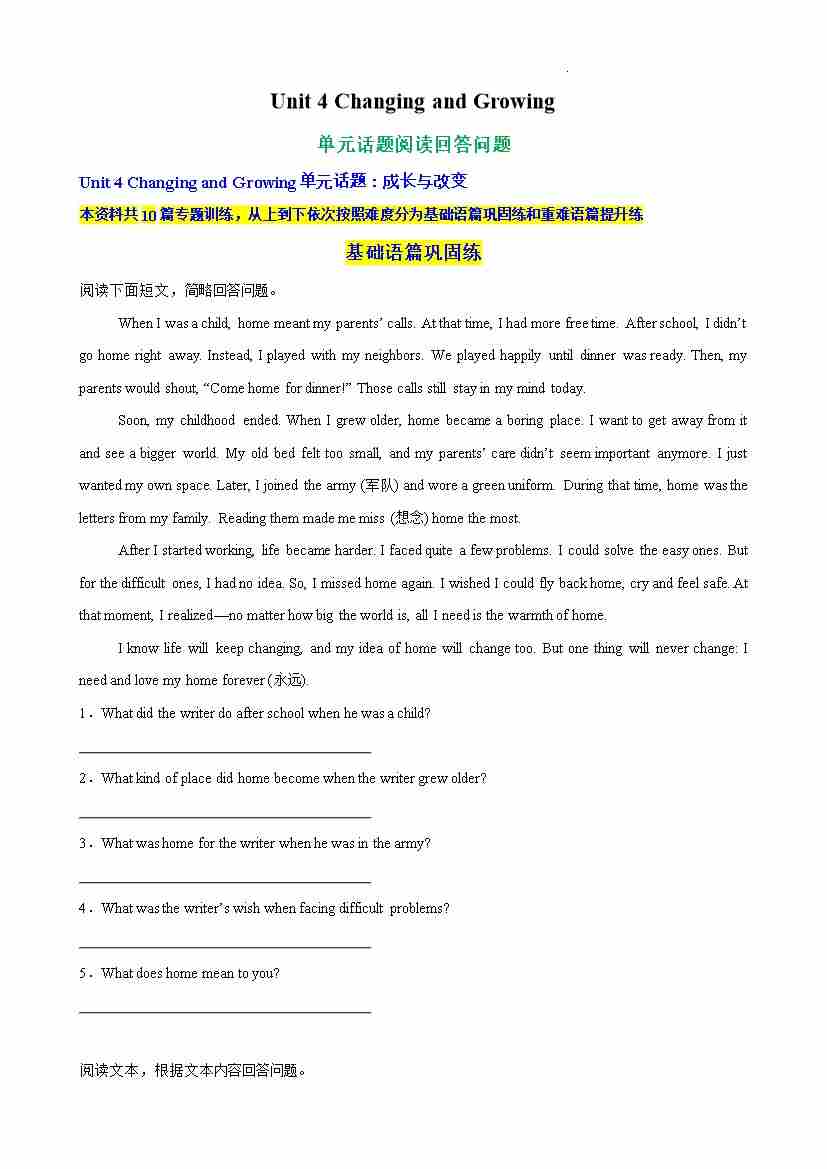 Unit 4 Changing and Growing单元话题阅读回答问题练习(原卷版)