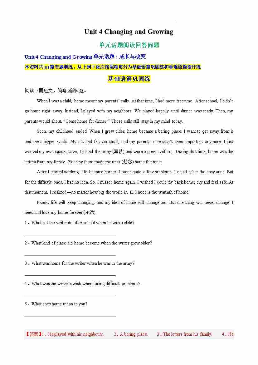 Unit 4 Changing and Growing单元话题阅读回答问题练习(解析版)