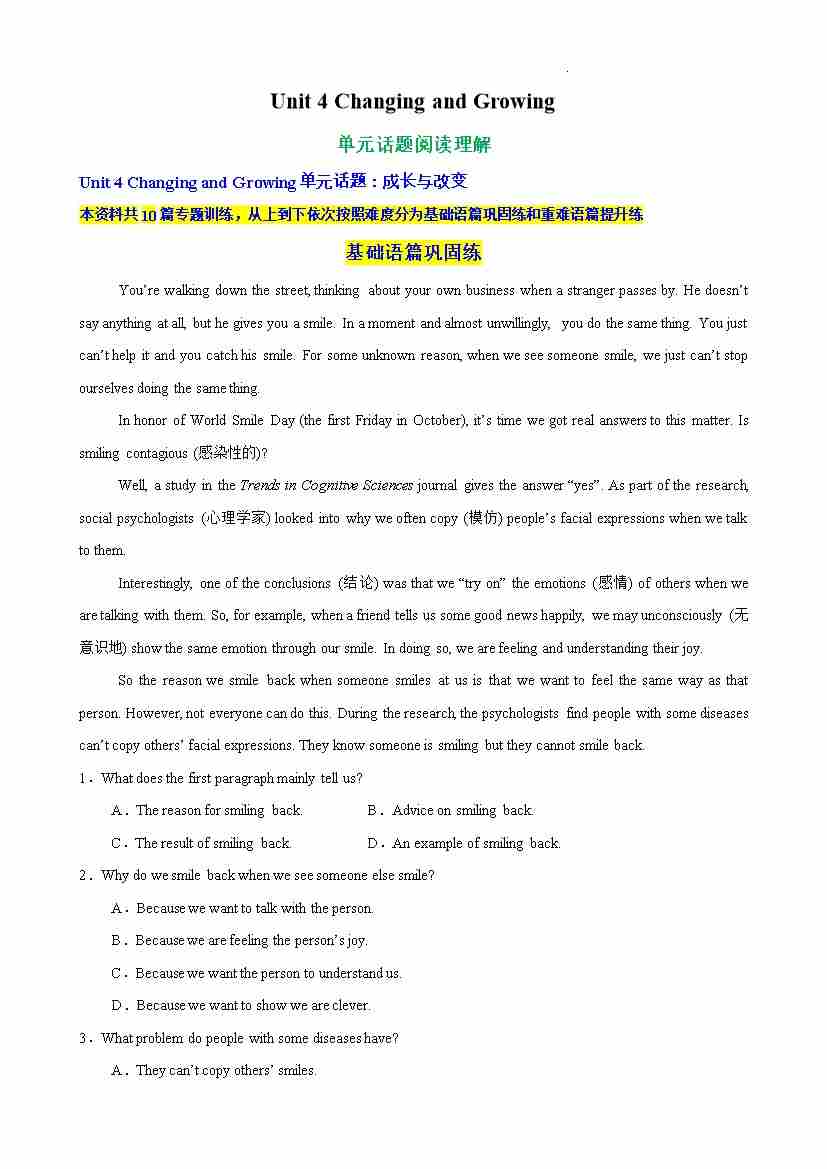 Unit 4 Changing and Growing单元话题阅读理解练习(原卷版)
