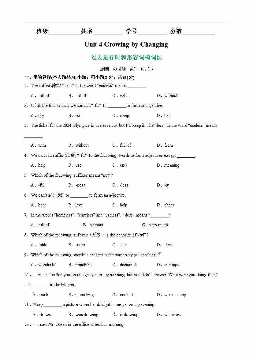 Unit 4 Growing by Changing 语法Grammar 过去进行时和形容词构词法(原卷版)