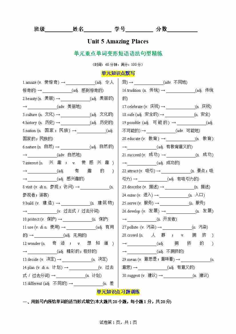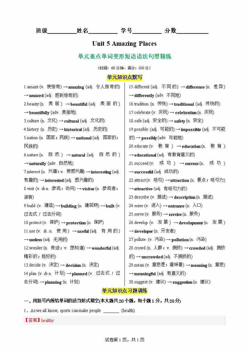 Unit 5 Amazing Places重点单词,词性转换,短语,语法,句型练习(解析版)