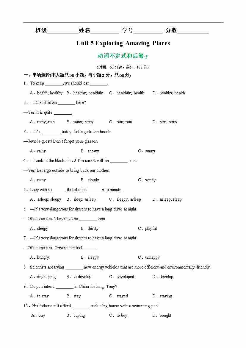 Unit 5 Exploring Amazing Places 语法Grammar 动词不定式和后缀-y(原卷版)