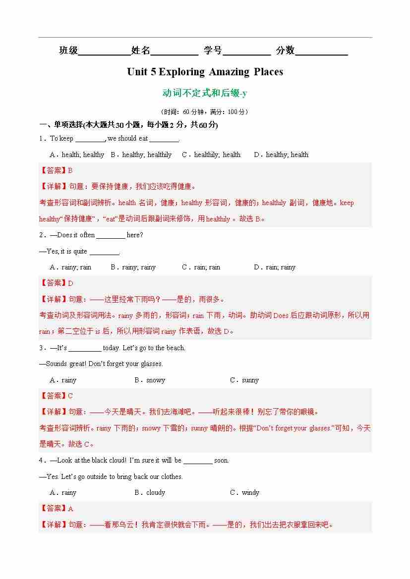 Unit 5 Exploring Amazing Places 语法Grammar 动词不定式和后缀-y(解析版)