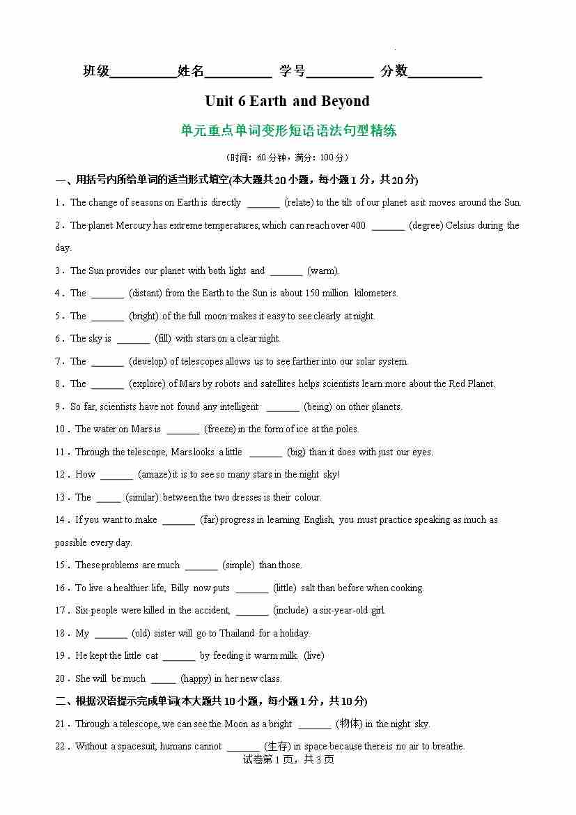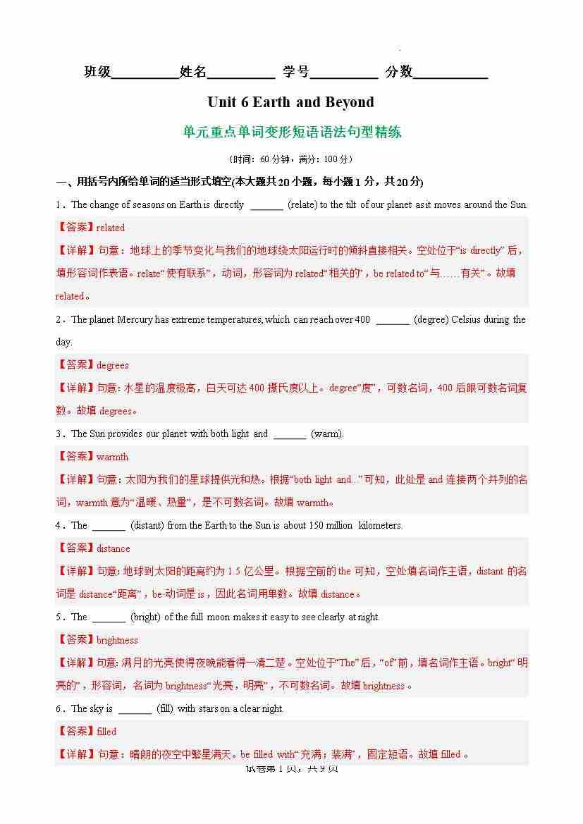 Unit 6 Earth and Beyond核心单词,词性转换,短语,语法,句型精练(解析版)