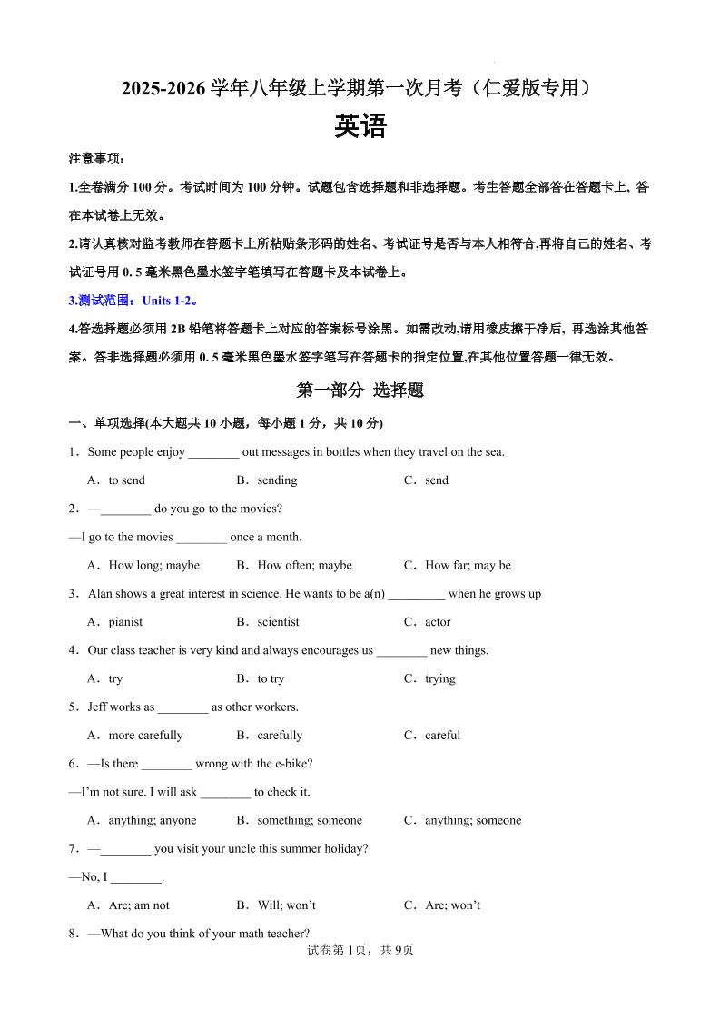 八年级英语上学期第一次月考(仁爱版专用)(测试范围:Units 1-2)(原卷版)