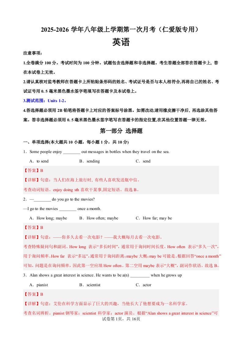 (仁爱版)八年级英语第一次月考卷(全解全析)(仁爱版2024)
