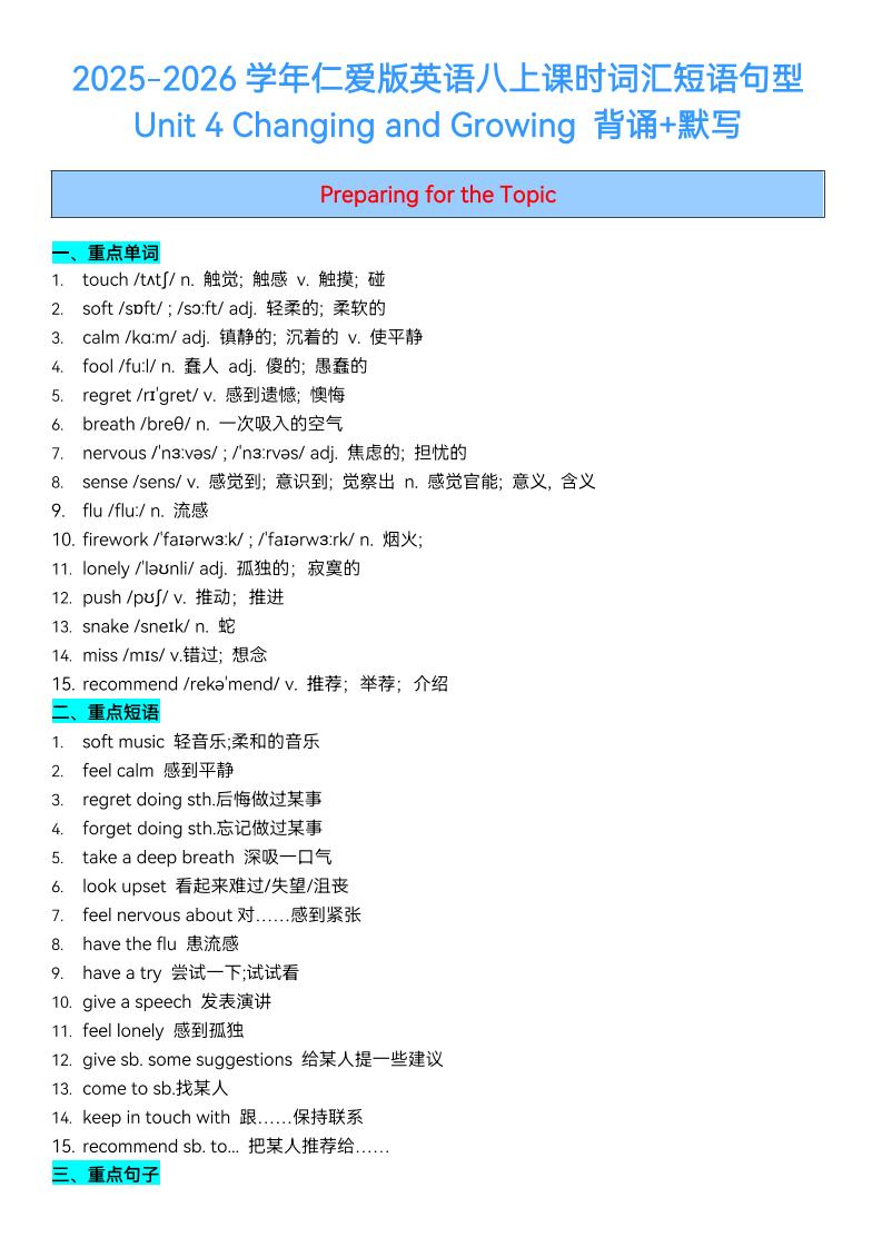 2025秋仁爱版八上英语Unit 4 Ghanging and Growing 课时词汇短语句型梳理(背诵默写)