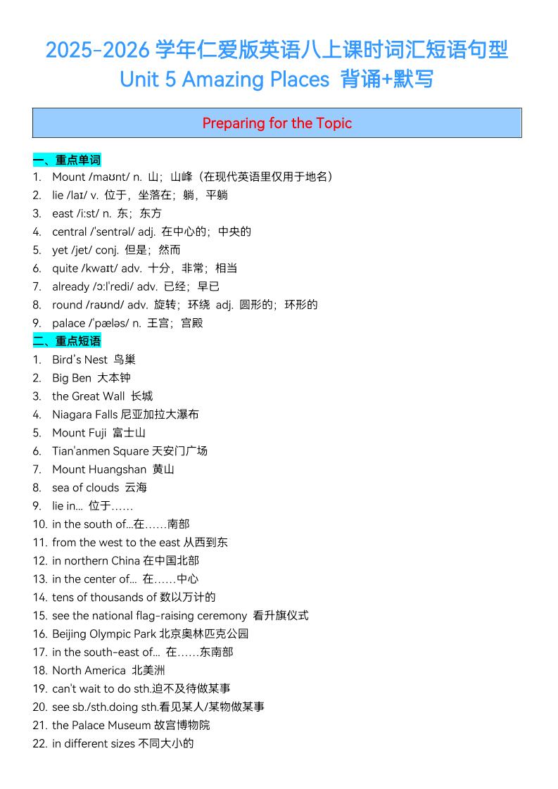 2025秋仁爱版八上英语Unit 5 Amazing Places 课时词汇短语句型梳理(背诵默写)