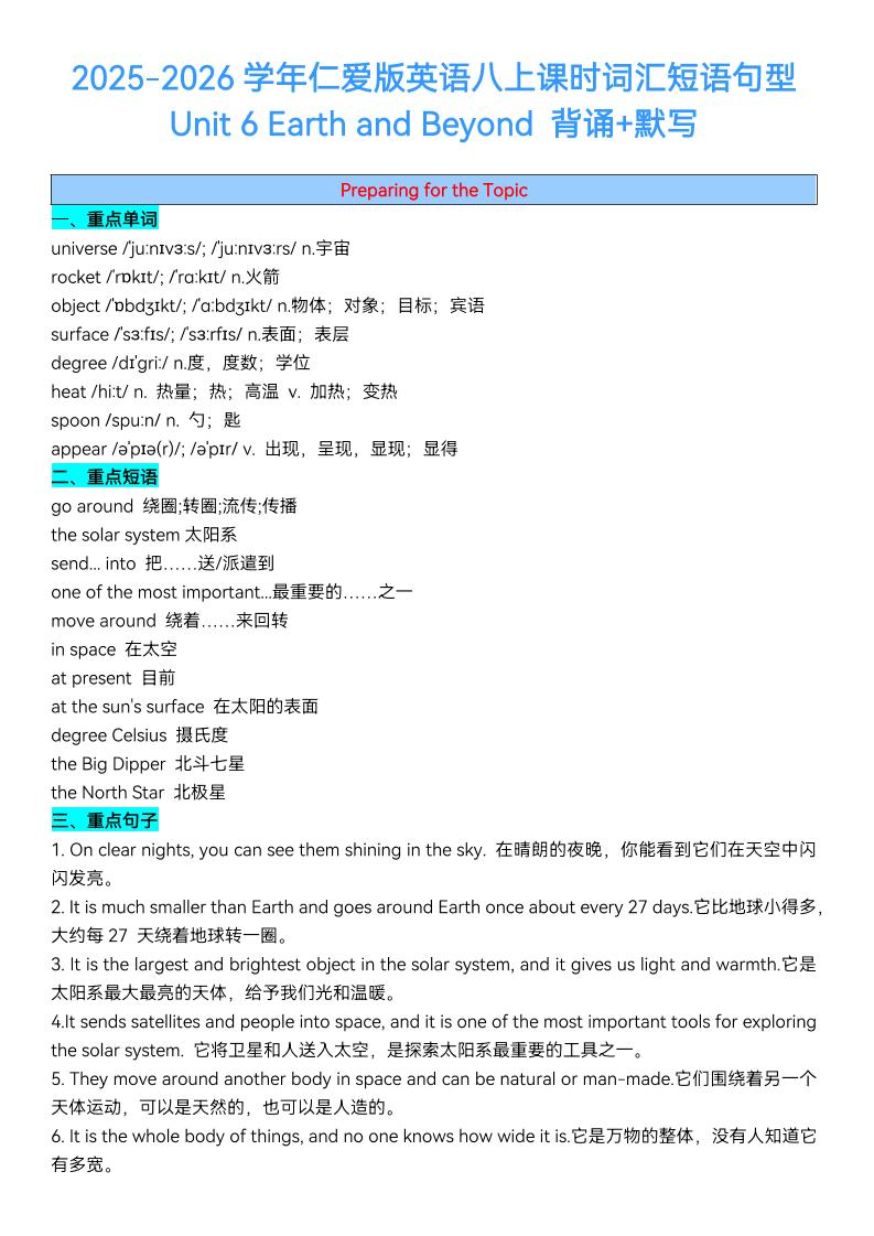 2025秋仁爱版八上英语Unit 6 Earth and Beyond 课时词汇短语句型梳理(背诵默写)