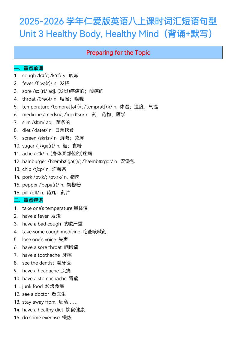 2025秋仁爱版英语八上Unit 3 Sound Body, Sound Mind课时词汇短语句型梳理(背诵默写)