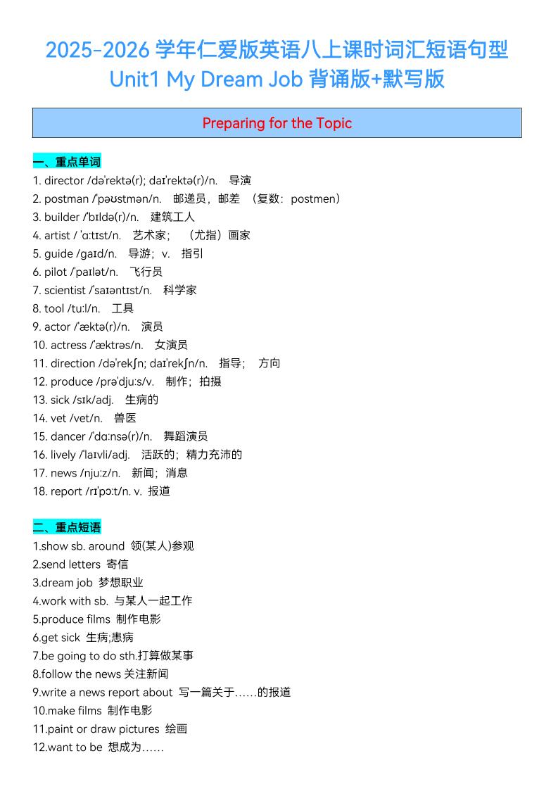 2025秋仁爱版英语八上Unit1 My Dream Job课时词汇短语句型梳理(背诵默写)