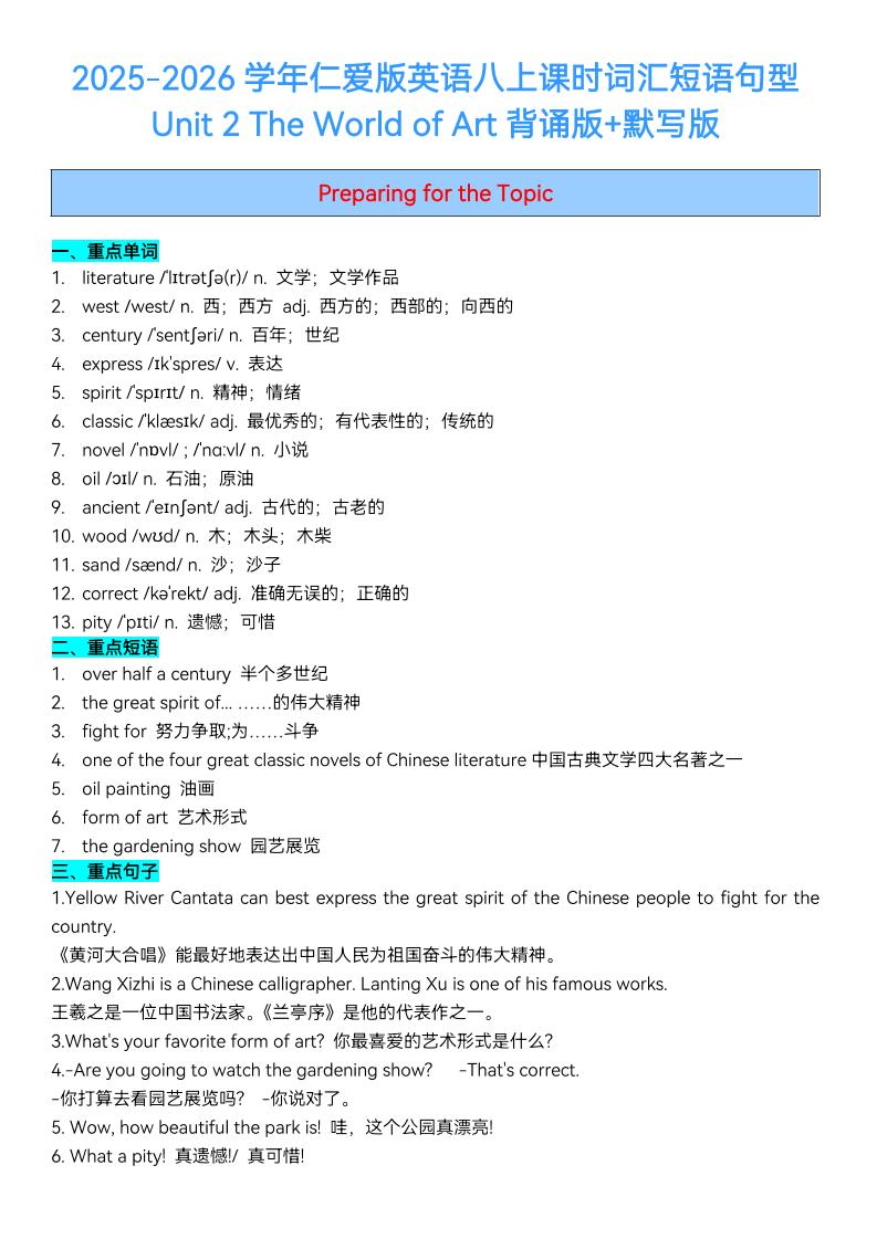 2025秋仁爱版英语八上Unit2 The World of Art课时词汇短语句型梳理(背诵默写)
