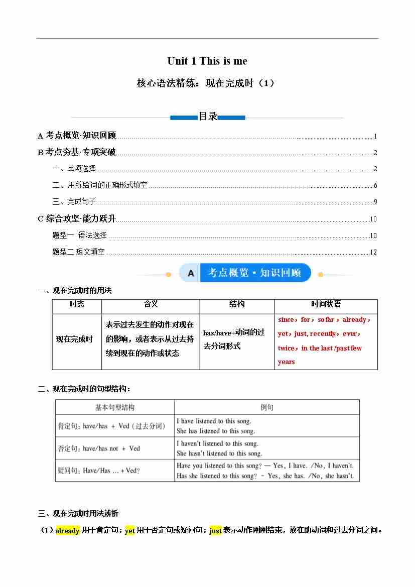 Unit 1 This is me 现在完成时(1)(单元核心语法精练)(原卷版)