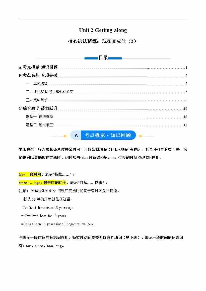 Unit 2 Getting along 现在完成时(2)(单元核心语法精练)(原卷版)