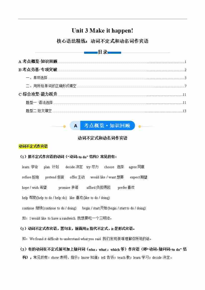 Unit 3 Make it happen! 动词不定式和动名词作宾语(单元核心语法精练)(原卷版)