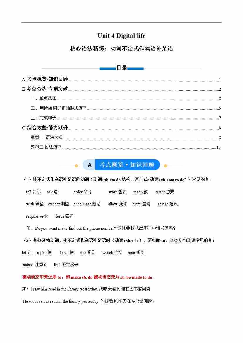 Unit 4 Digital life动词不定式作宾语补足语(单元核心语法精练)(原卷版)