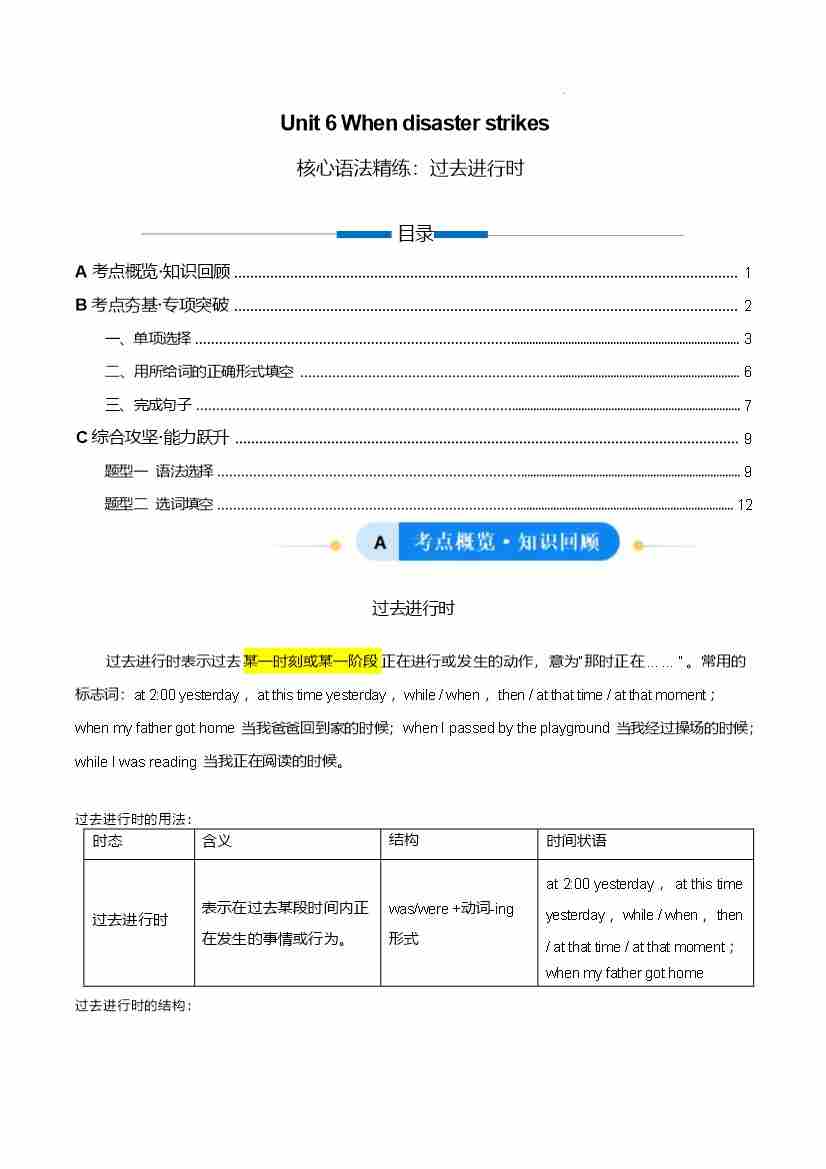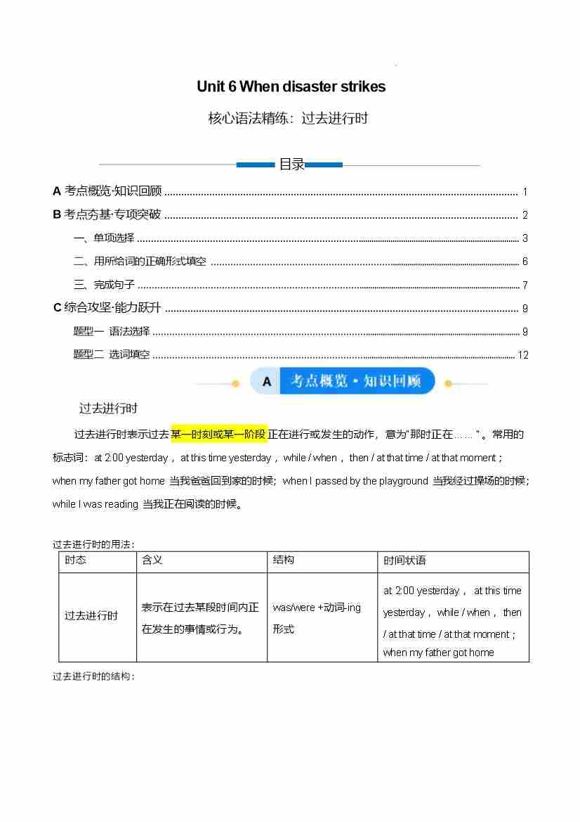 Unit 6 When disaster strikes 过去进行时(单元核心语法精练)(原卷版)