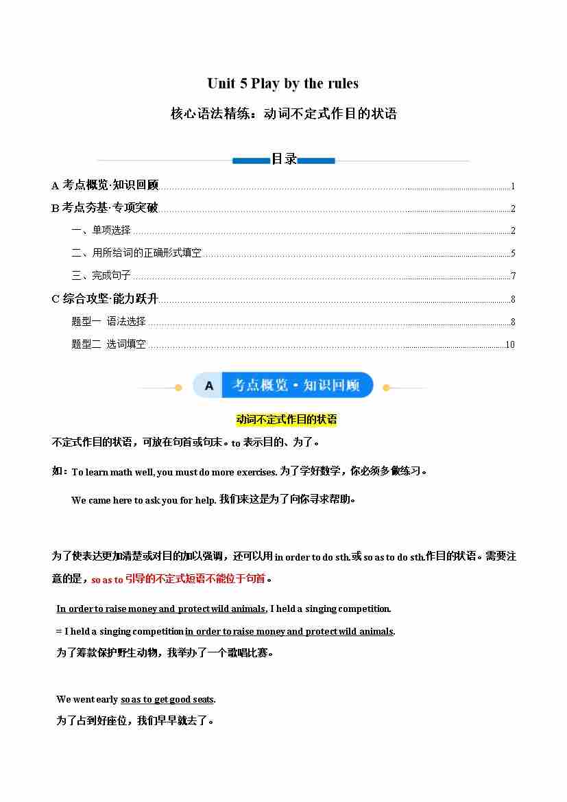 Unit 5 Play by the rules 动词不定式作目的状语(单元核心语法精练)(解析版)