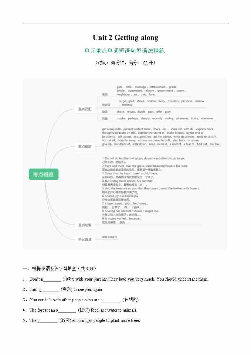 Unit 2 Getting along 单词短语句型语法(教材考点精练)(原卷版)