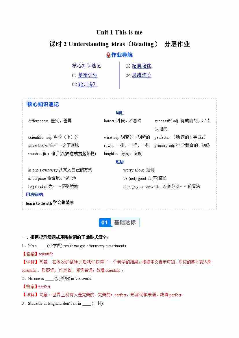 Unit 1 课时2 Understanding ideas(Reading)(分层作业)(解析版)