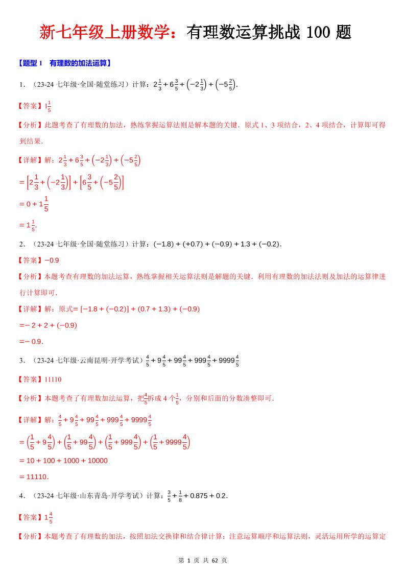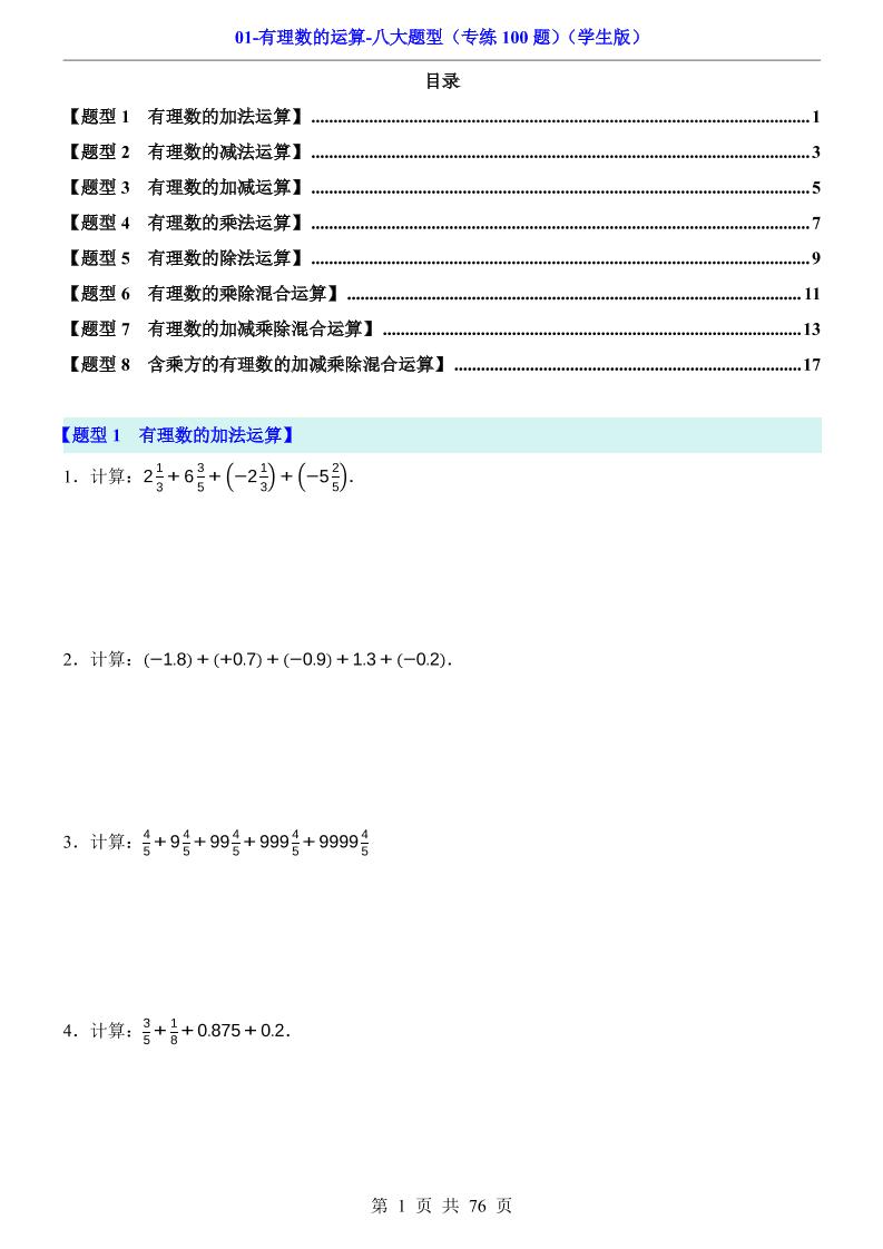 七上数学有理数的运算八大题型专项训练(100题)(解析版)