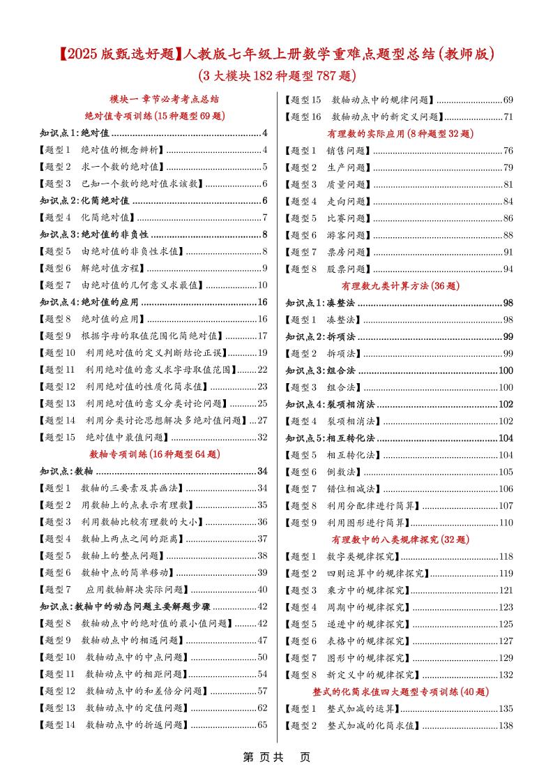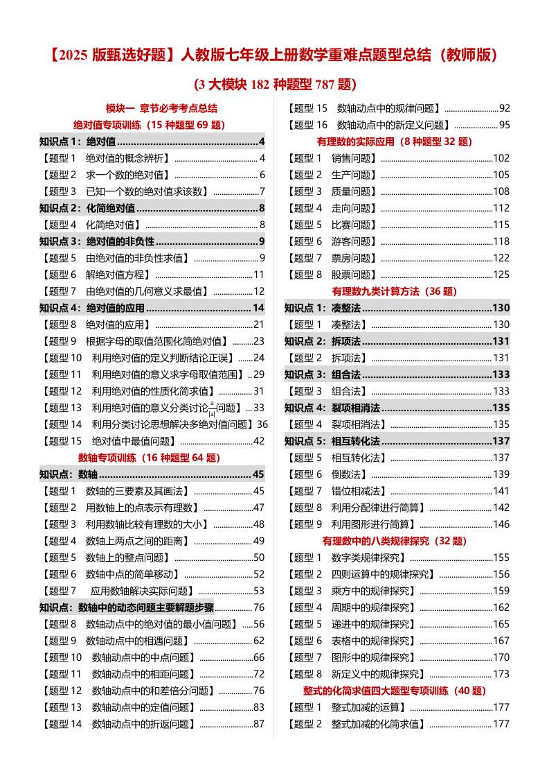 (精编版)【2025版甄选好题】人教版七年级上册数学重难点题型总结(3大模块182种题型787题)(教师版)