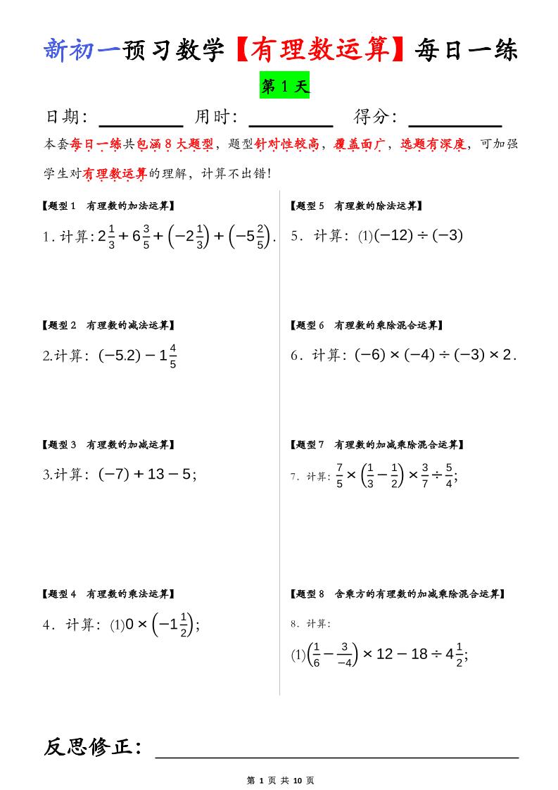 【1】新初一预习数学有理数运算每日一练