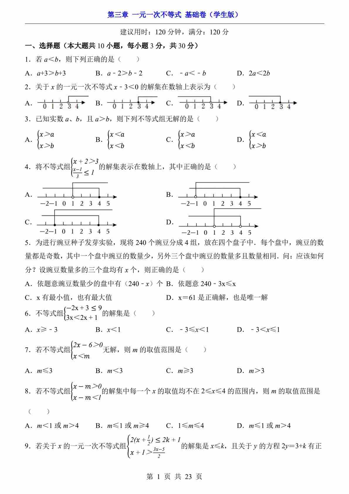八上数学第3章 一元一次不等式测试·基础卷(考试版A4)