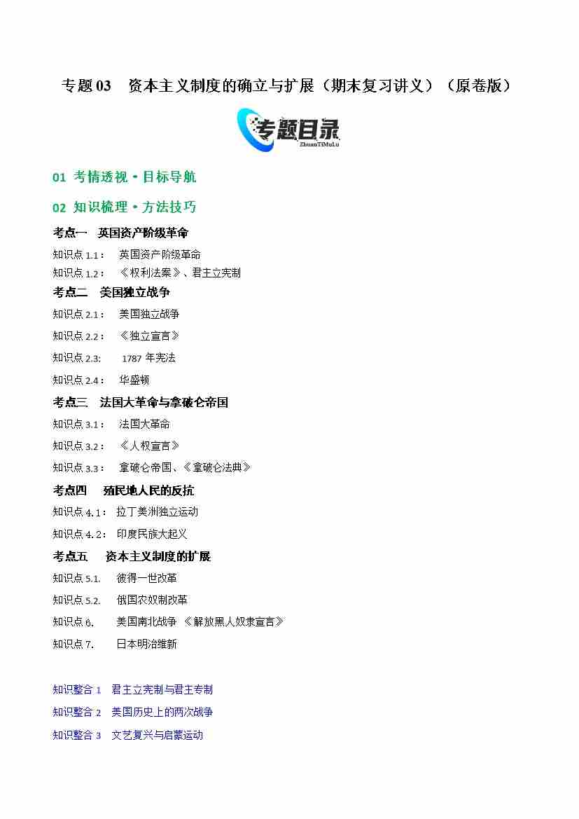 专题03 资本主义制度的确立与扩展(期末复习讲义) (原卷版)