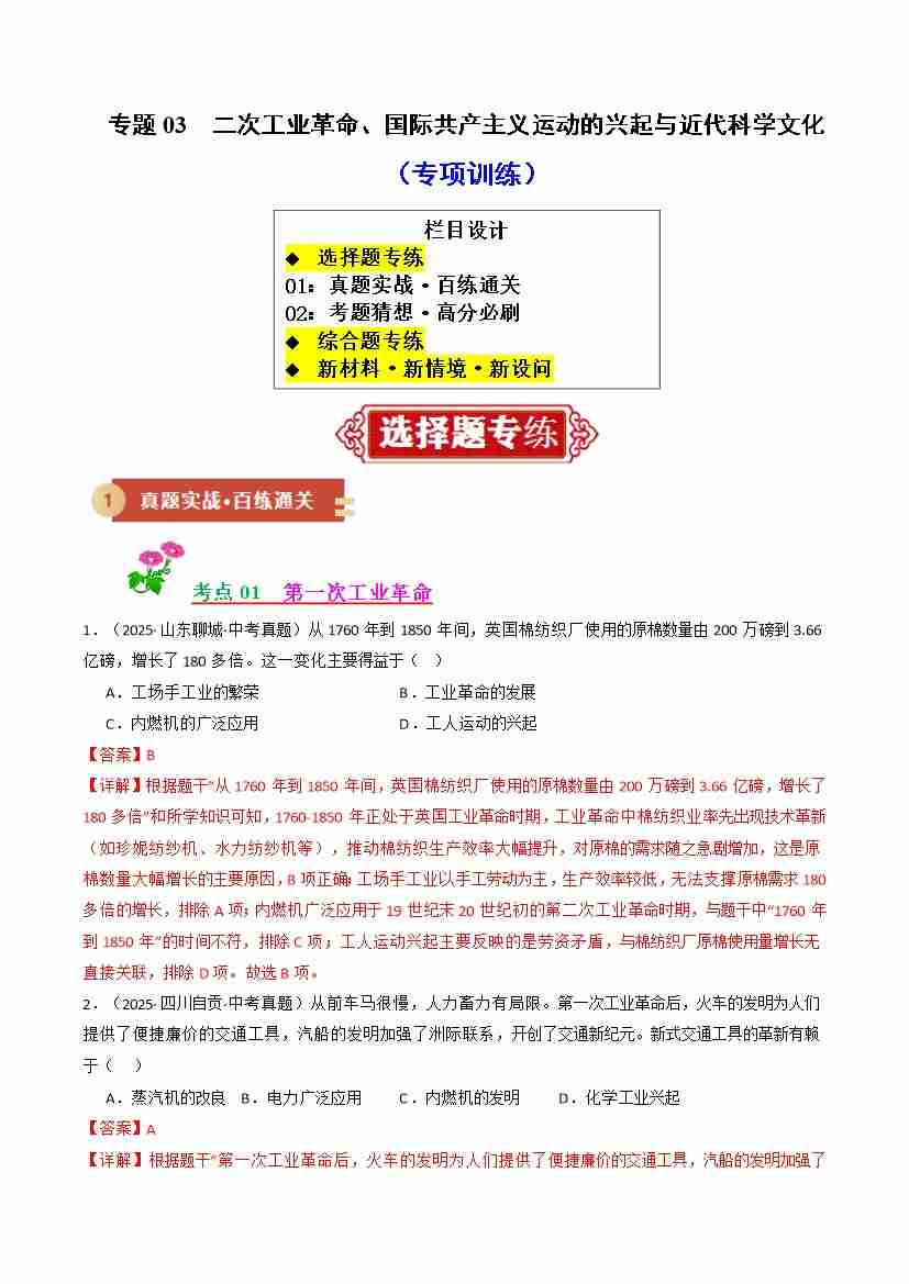 专题03 二次工业革命、国际共产主义运动的兴起与近代科学文化(期末复习专项训练)(教师版)