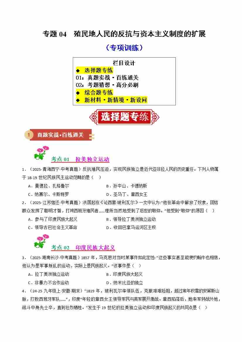专题04 殖民地人民的反抗与资本主义制度的扩展(期末复习专项训练)(学生版)