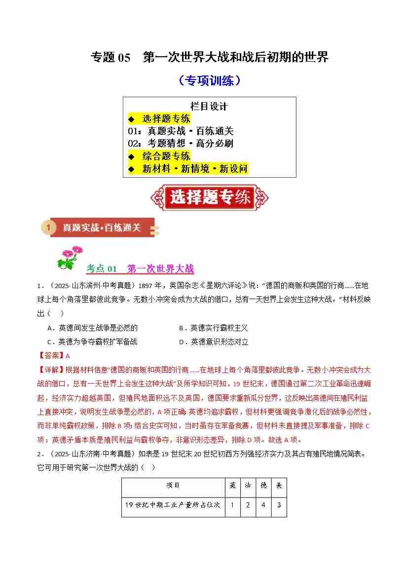 专题05 第一次世界大战和战后初期的世界(期末复习专项训练)(教师版)