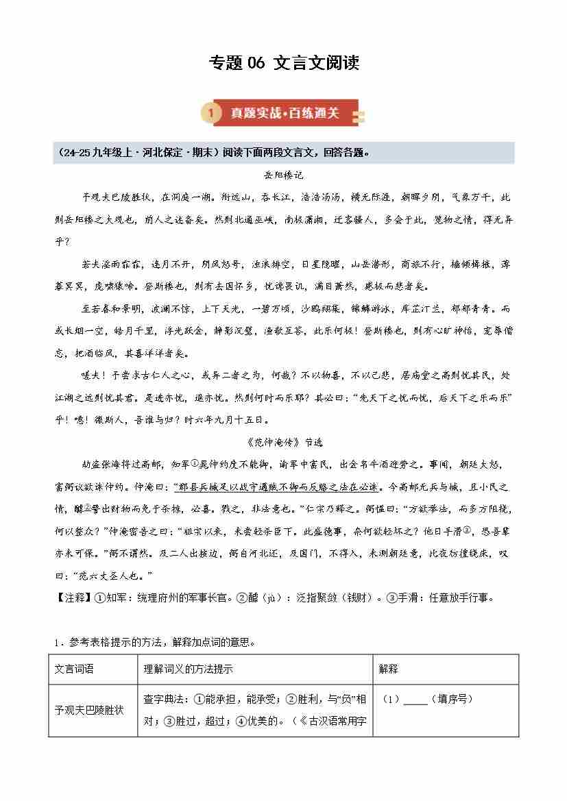 专题06 文言文阅读(期末专项训练)(教师版)