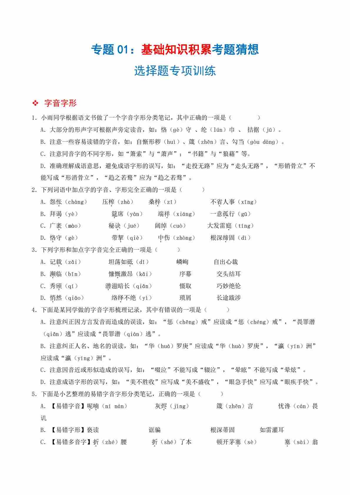 专题01 基础知识积累(选择题)(考题猜想)(原卷版)