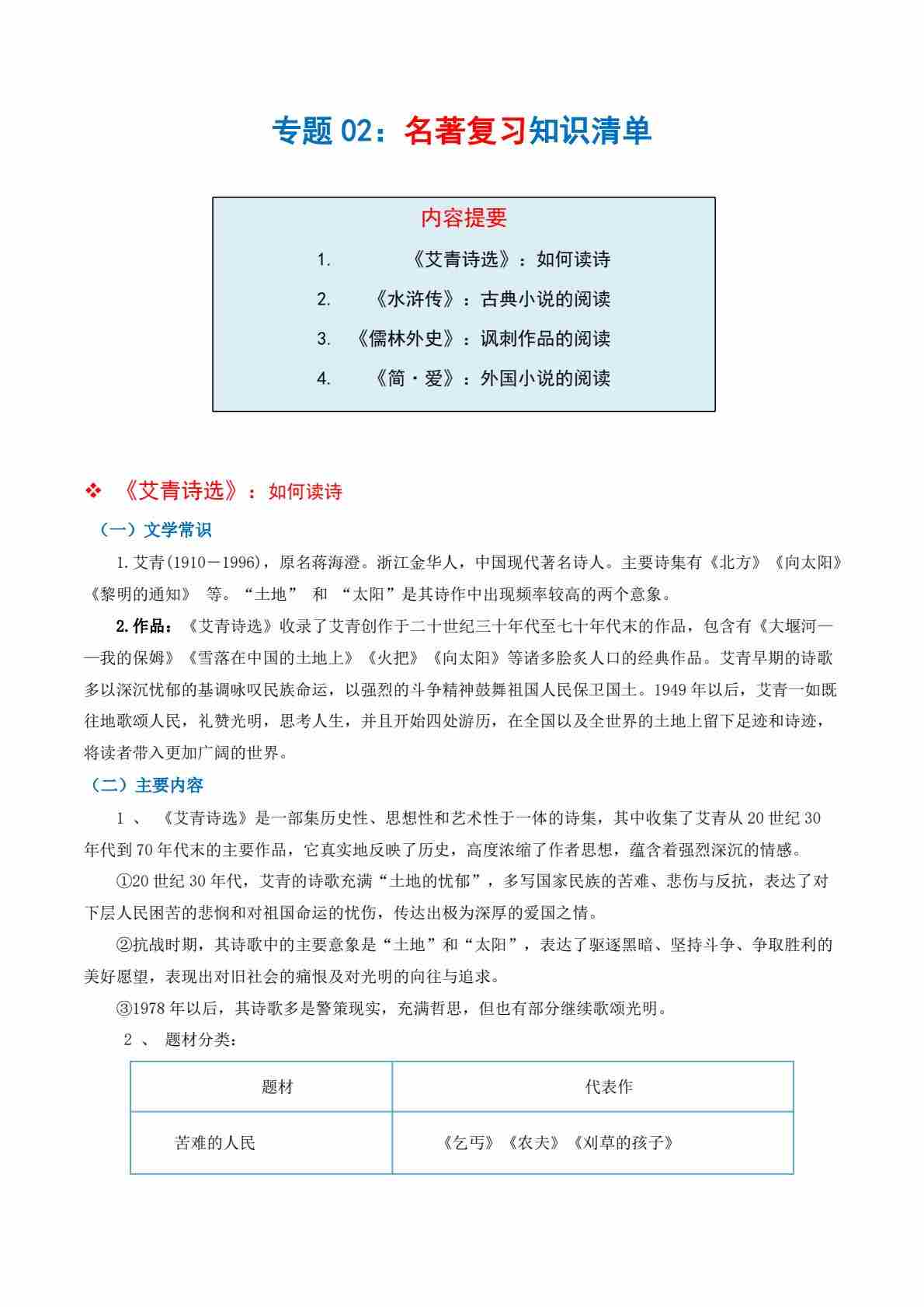 专题02 名著阅读:儒林外史、简爱、艾青诗选、水浒传(知识清单)-2024-2025学年九年级语文上学期期末考点大串讲(统编版)