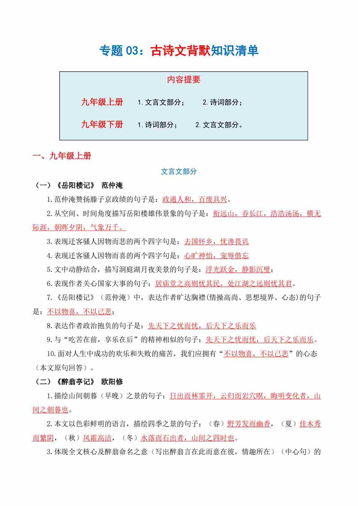 专题03 名篇名句默写(知识清单)-2024-2025学年九年级语文上学期期末考点大串讲(统编版)