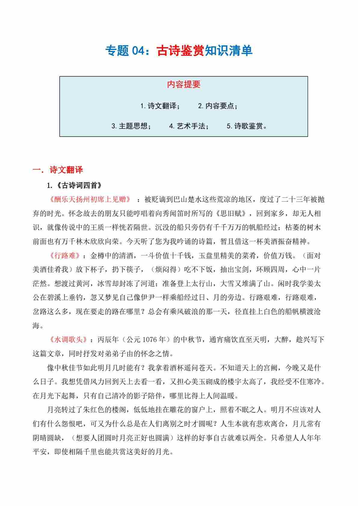 专题04 古诗鉴赏(知识清单)-2024-2025学年九年级语文上学期期末考点大串讲(统编版)