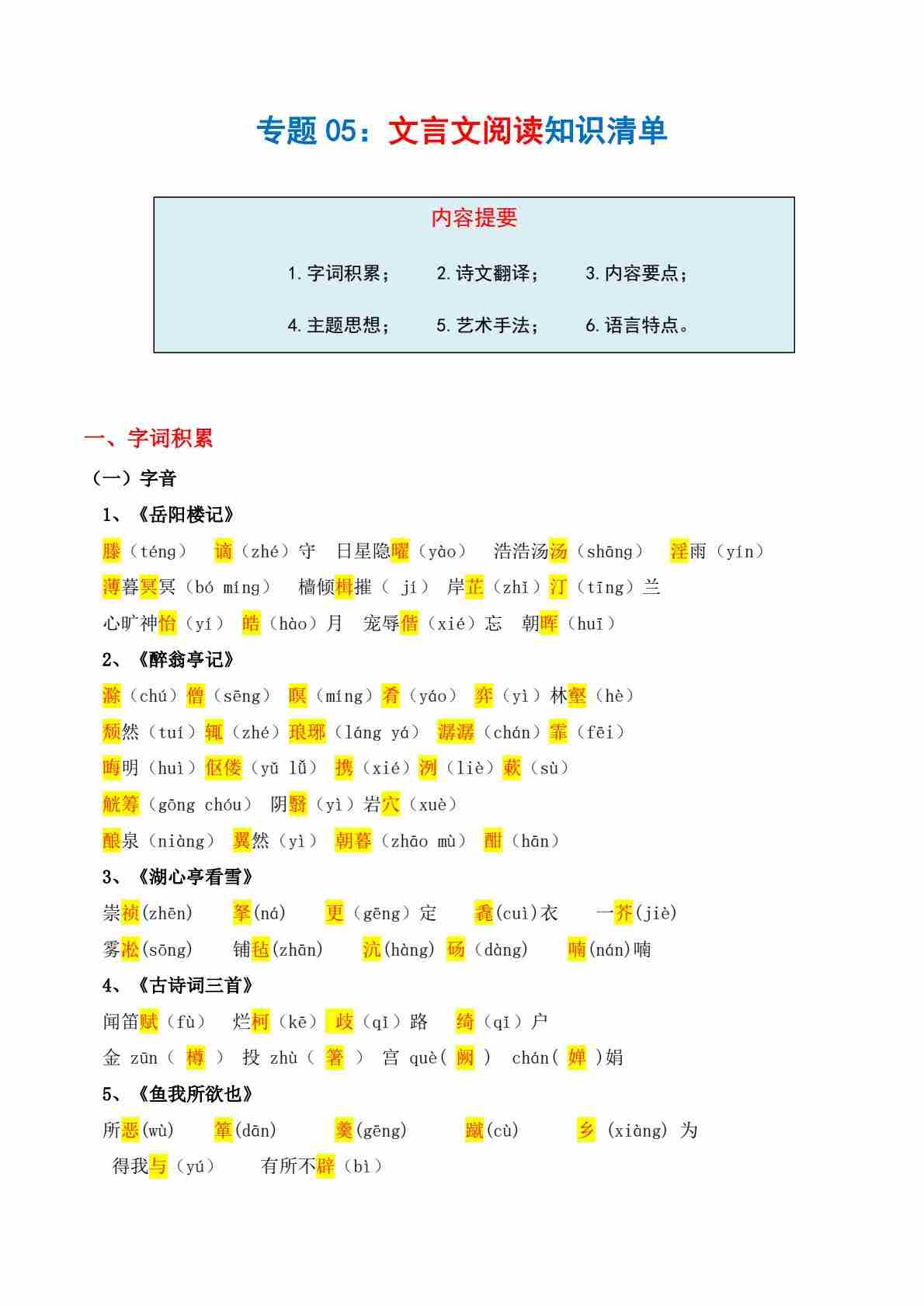 专题05 文言文阅读(知识清单)-2024-2025学年九年级语文上学期期末考点大串讲(统编版)