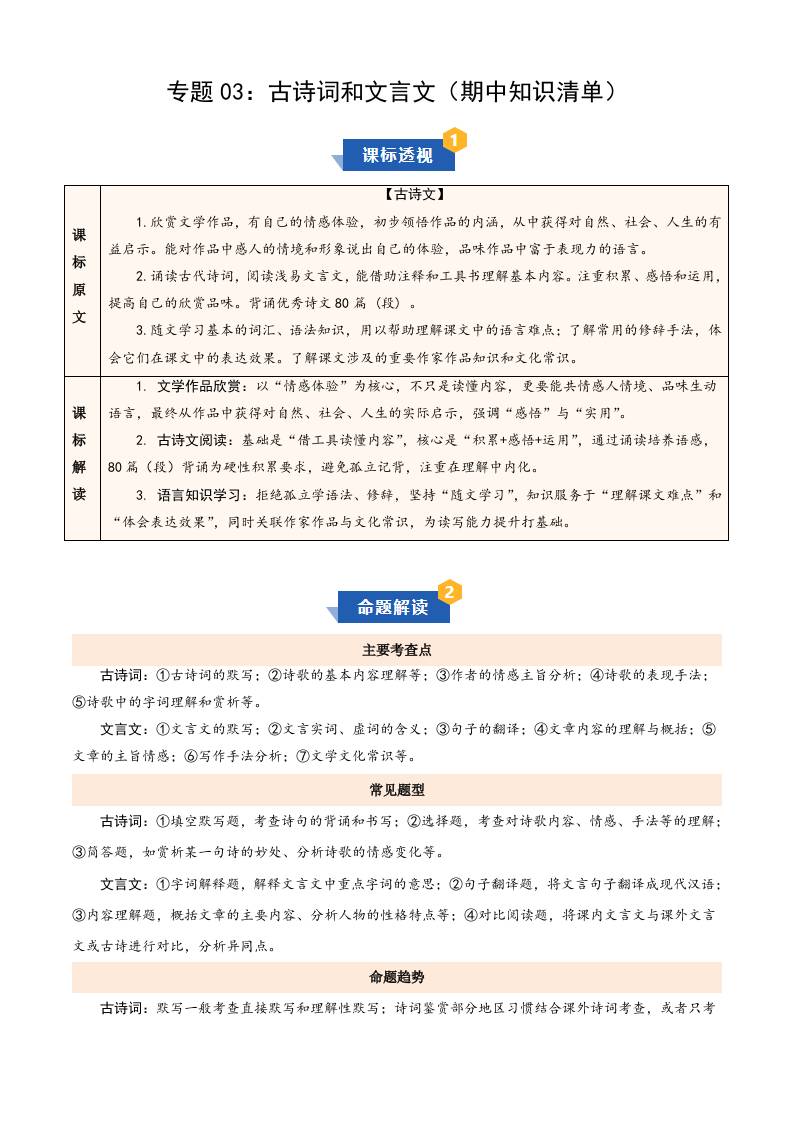 专题03:古诗和文言文(期中知识清单)