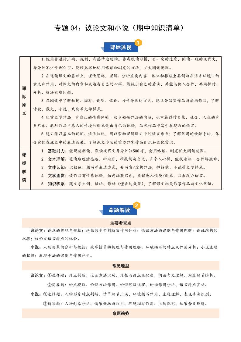 专题04:议论文和小说(期中知识清单)