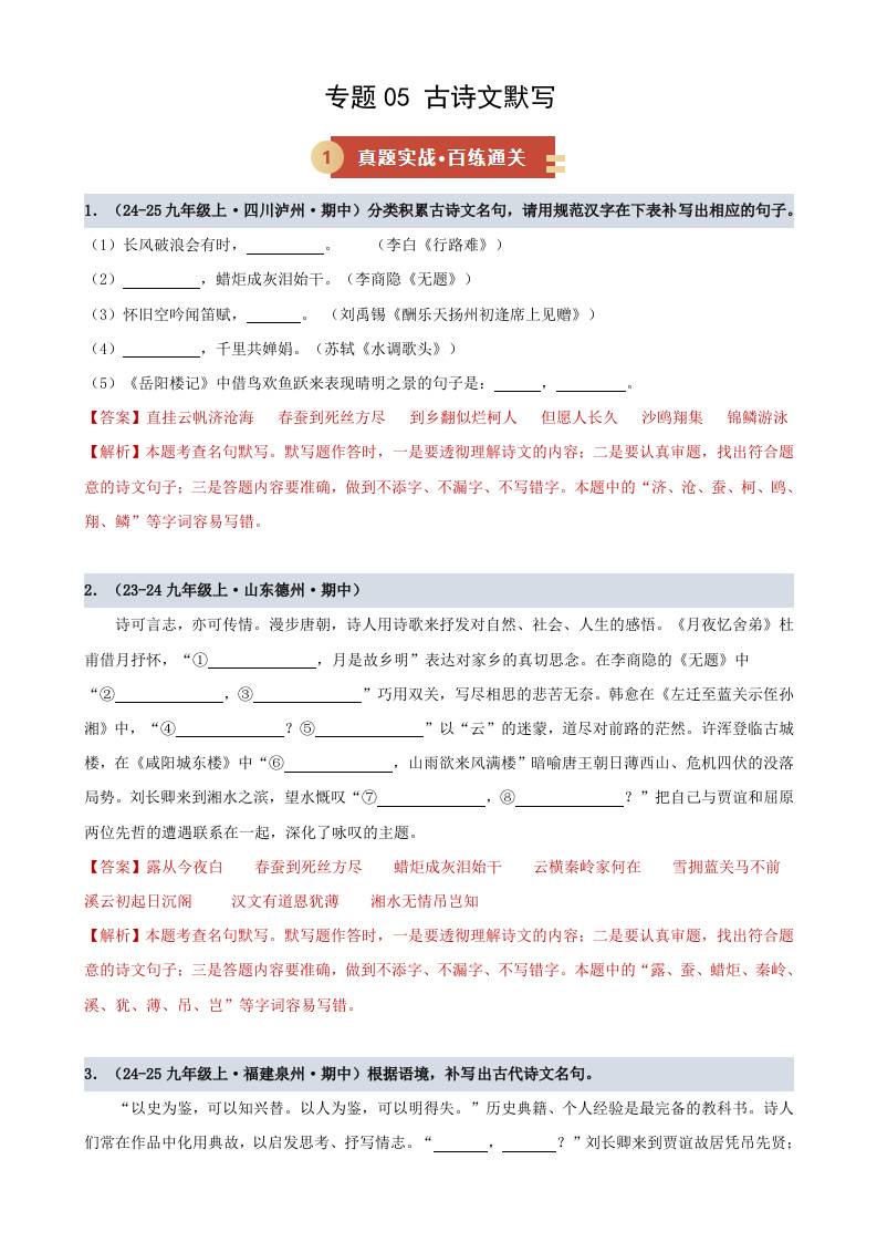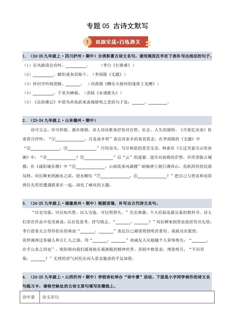专题05 古诗文默写(期中专项训练)(学生版)
