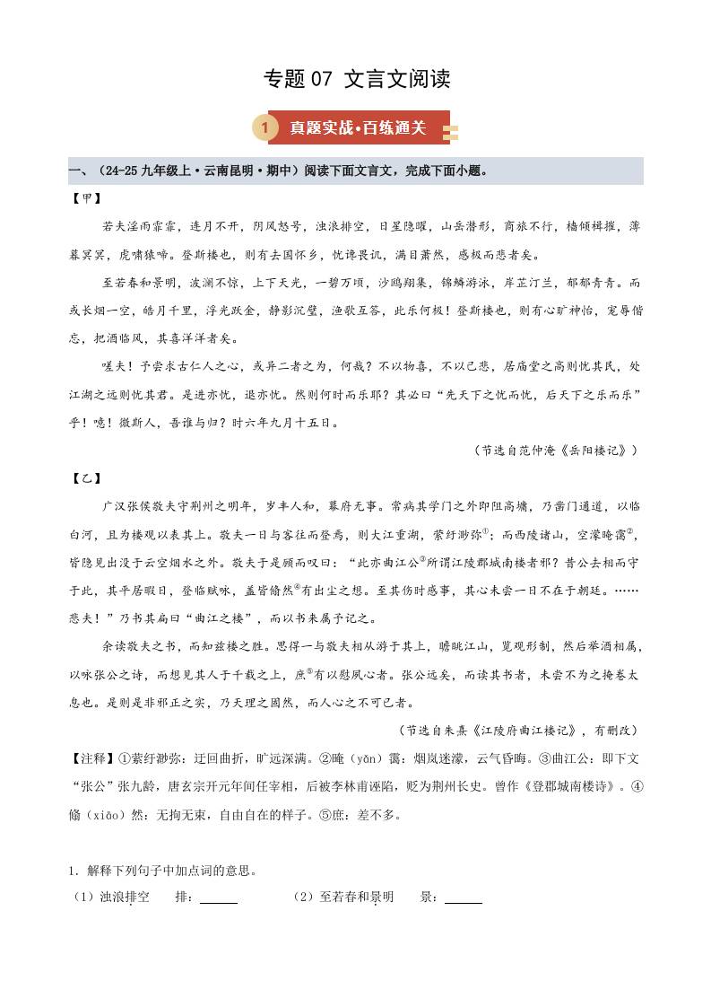 专题07 文言文阅读(期中专项训练)(学生版)