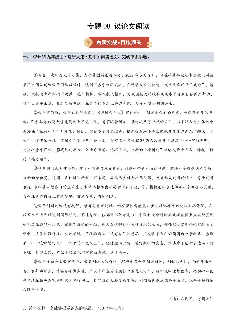 专题08 议论文阅读(期中专项训练)(学生版)