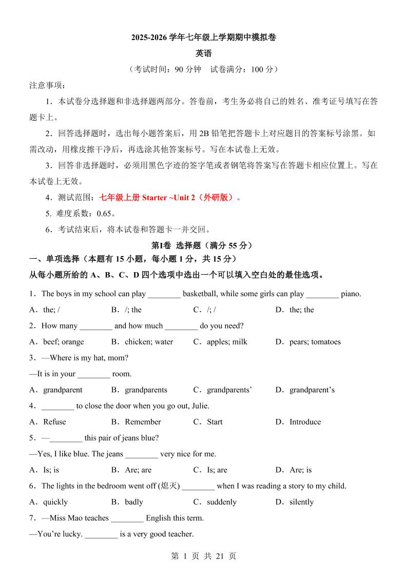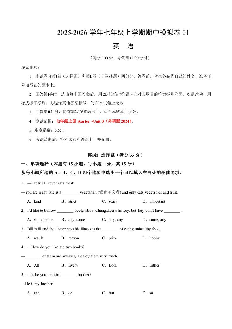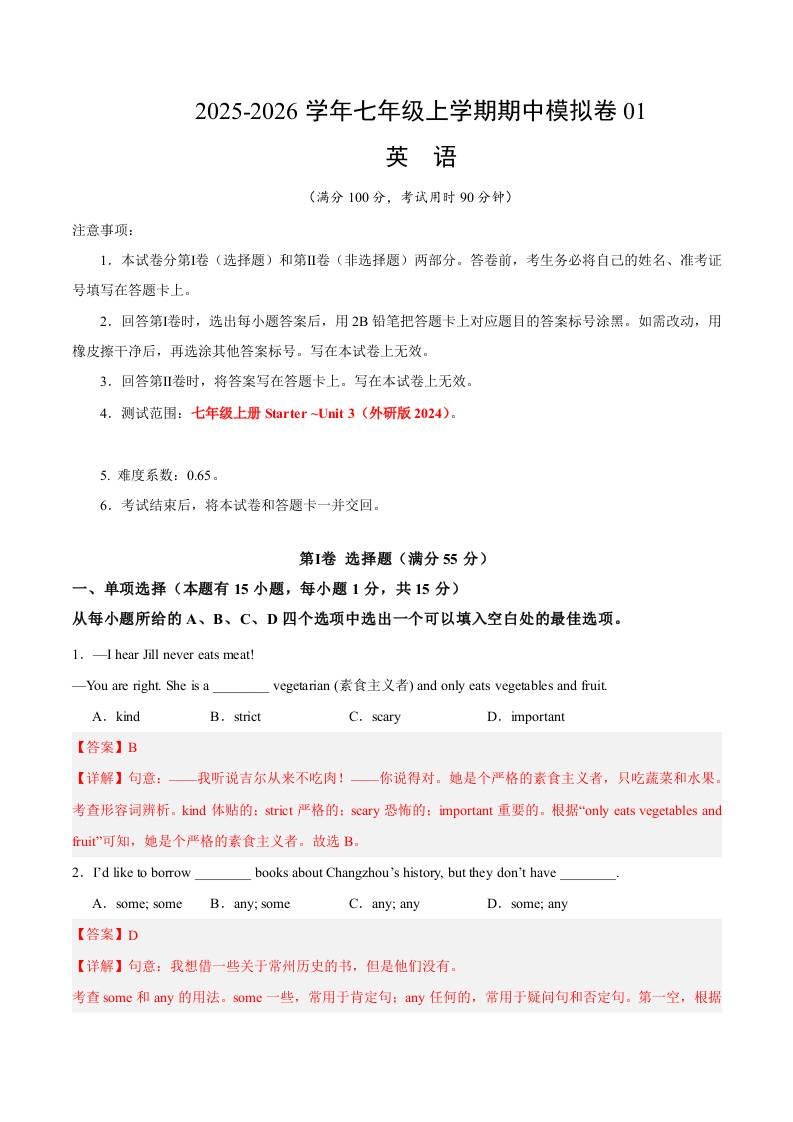 七年级英语上学期期中模拟卷01(教师版)...