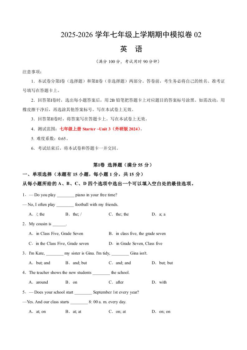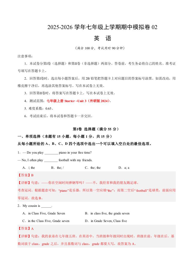 七年级英语上学期期中模拟卷02(教师版)..