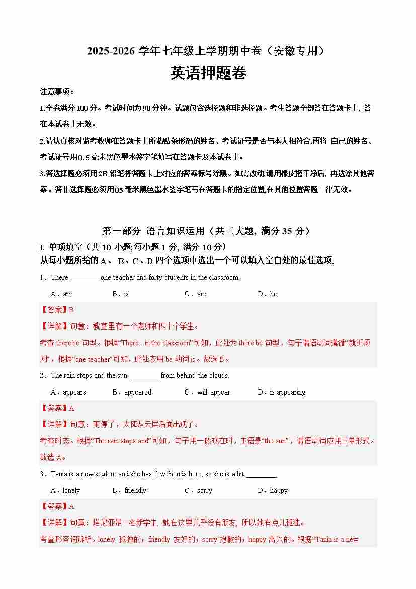 七年级英语上学期期中临考押题卷(安徽专用)(教师版)