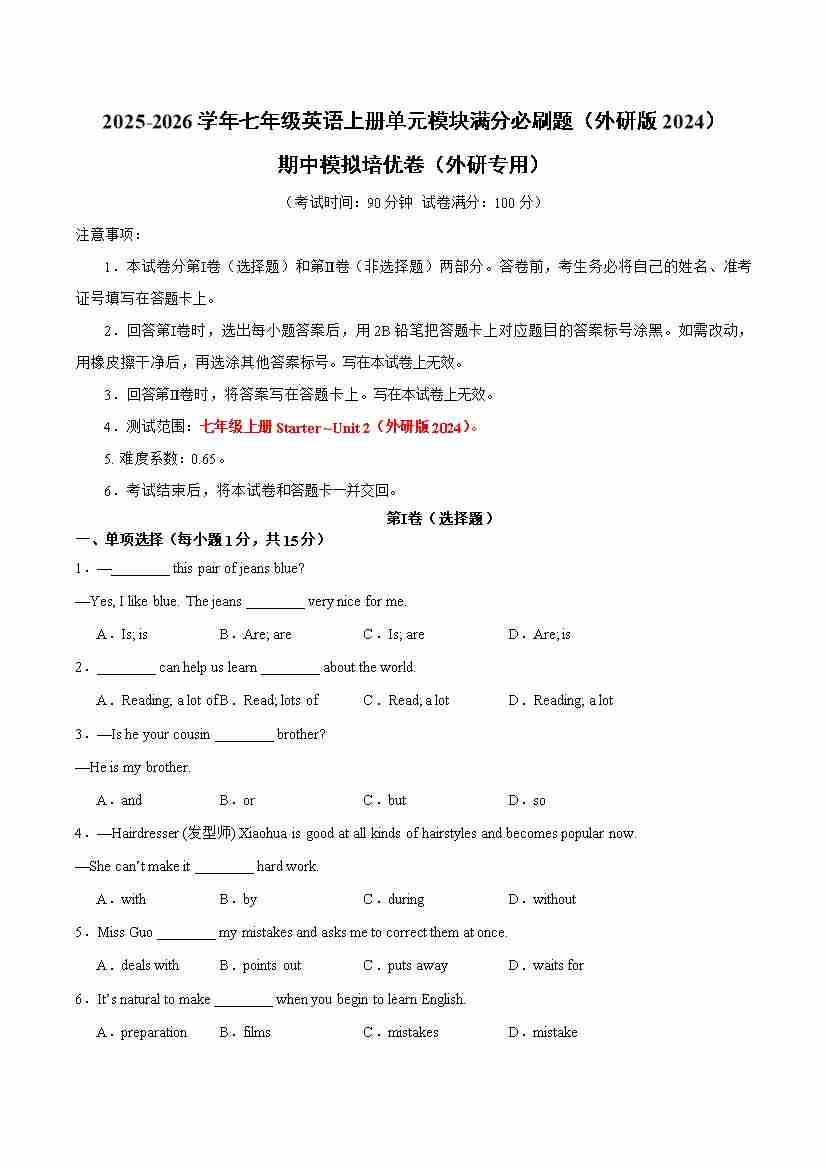 期中模拟培优卷(外研专用)(学生版)(外研版2024)